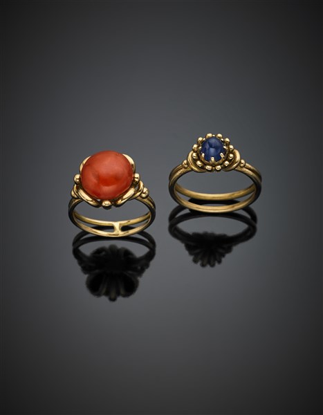 Lotto di due anelli in oro giallo, uno con corallo rosso e l'altro con zaffiro cabochon, misure 14/54 e 16/56, complessivi g 13,60.