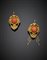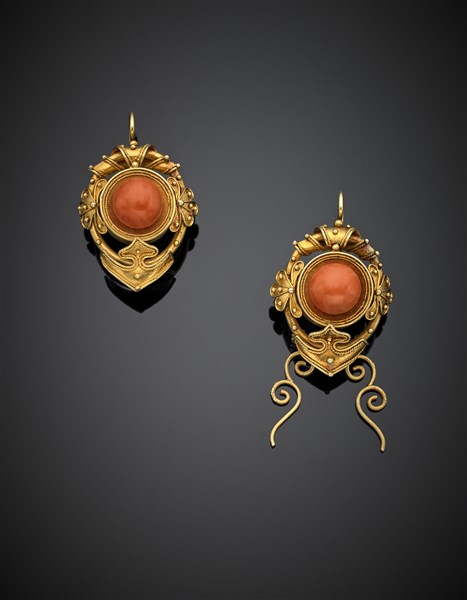 Orecchini pendenti a cartiglio rifiniti con cordoncini e perlinature in oro giallo e al centro due bottoni di corallo arancione di mm 9.50 circa, in uno degli orecchini mancano i due pendenti. Lungh. 3.80 cm circa l'uno e 2.90 cm circa l'altro. g 10,97.