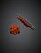 Lotto composto da due spille una in oro giallo e una in metallo rifinite con boules di corallo rosso e rosso arancione, una di cm 3 e l'altra cm 7.40 circa, complessivi g 14,56.