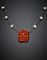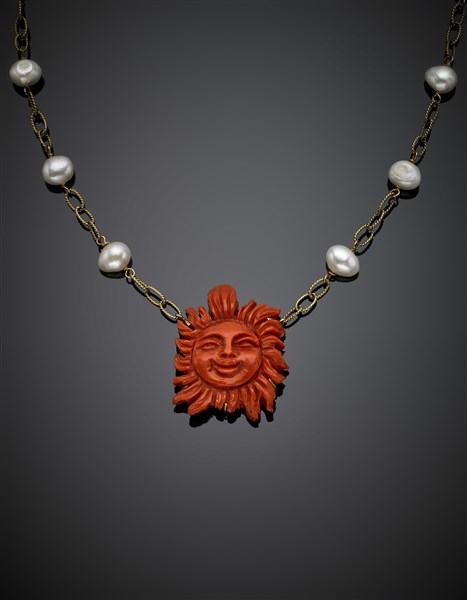 Catena in oro giallo e perle irregolari rifinita in centro con sole scolpito in corallo rosso arancione, g 35,79, lungh. cm 55,50 circa.
