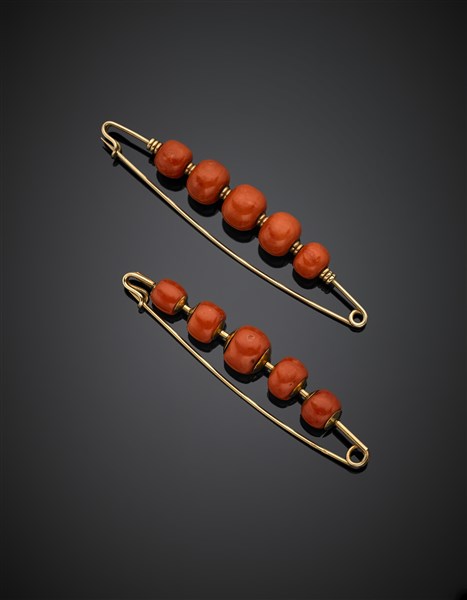Two yellow gold and red orange coral graduated bead safety pins, bead diam. from mm 8 to mm 12, in all g 25.49, length cm 8.50 circa. Unknown mark.