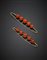Due spilloni in oro giallo rifiniti con boules di corallo rosso/arancione a scalare da mm 8 a mm 12 circa , complessivi g 25,49, lungh. cm 8,50 circa. Marchio non noto.