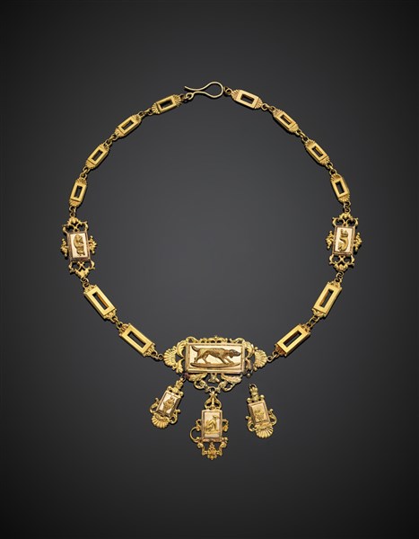 Collier modulare in lastra d'oro giallo sbalzato e cesellato con centrale rifinito con pendenti, i moduli sono rifiniti con figure di cani e fiori applicate, g 12,61, lungh. cm 42 circa. Marchi francesi. (difetti)