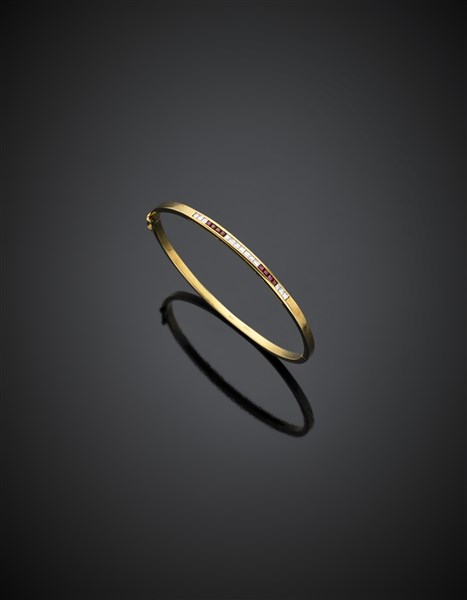 Bracciale rigido, apribile in oro giallo rifinito con diamanti e rubini carrè,