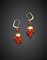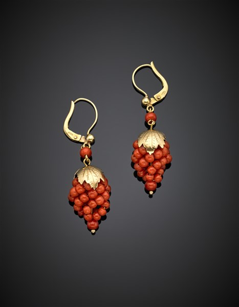 Red orange coral yellow gold grape pendant earrings, g 6.23, length cm 4.80 circa. Marked 170 TO.