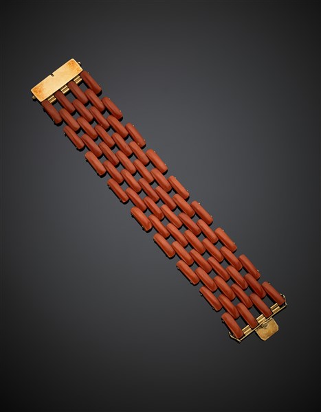 Bracciale a fascia modulare in corallo rosso aranciato con chiusura in oro giallo, g 51,16, lungh. cm 20,20, h cm 3,50 circa.