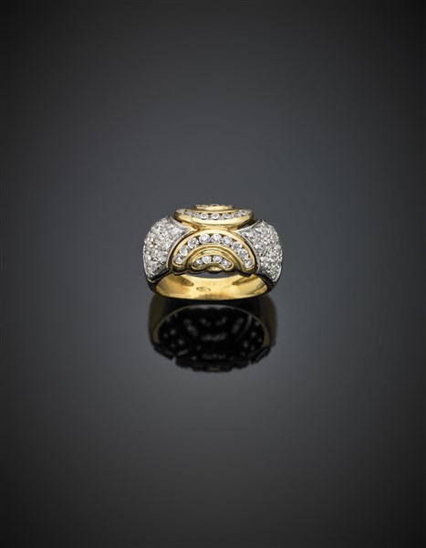 Anello in oro giallo e bianco con motivo a volute rifinito con pietre incolori g 8,31 misura 18/58. Marcati 803 AL.