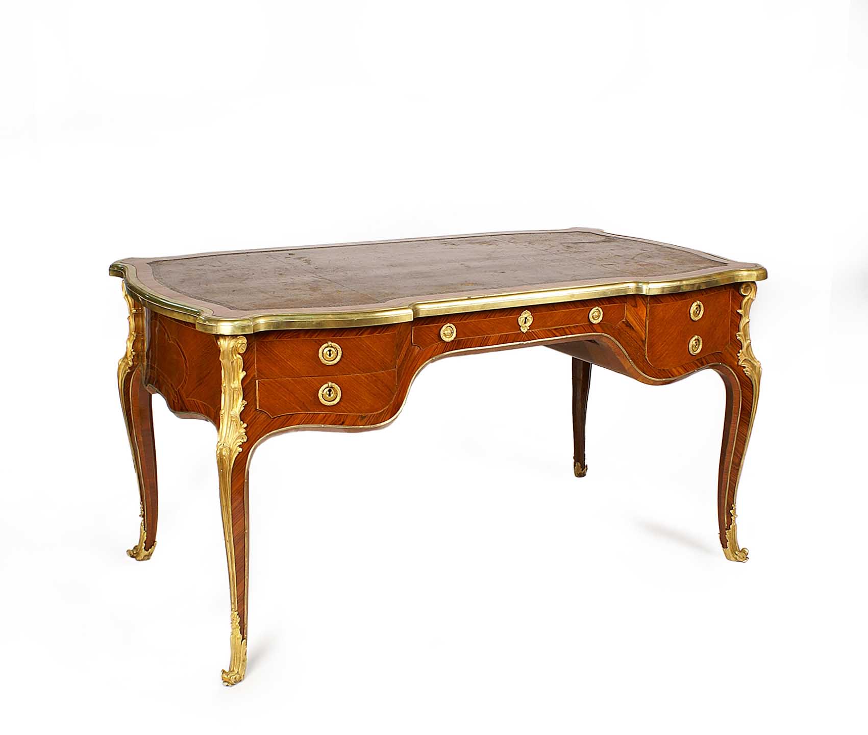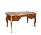 SCRIVANIA DA CENTRO Francia, periodo Napeleone III In ebano viola intarsiato e filettato in legno di frutti vari, con ricche applicazioni in bronzo dorato e cesellato, piano sagomato e rivestito in cuoio Dim. 78x147x80 cm.