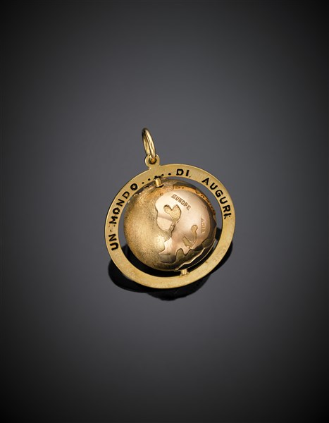 Pendente a guisa di mappamondo in oro giallo con incisione un mondo di auguri