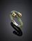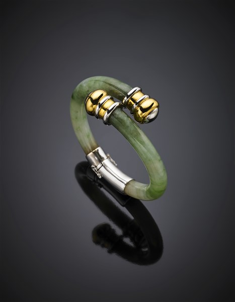 Bracciale in giada varietà giadeite rigido con apertura sul retro rifinito in oro bianco e oro giallo, g 95,49, diam. cm 4,60.