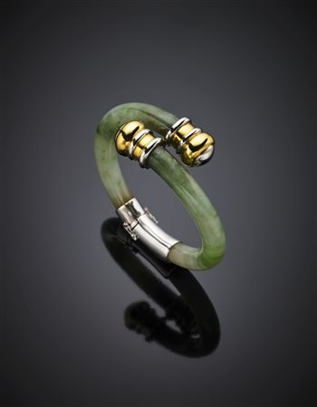 Jadeite adjustable bangle with bi-colored gold details, g 95.49, diam. cm 4.60.