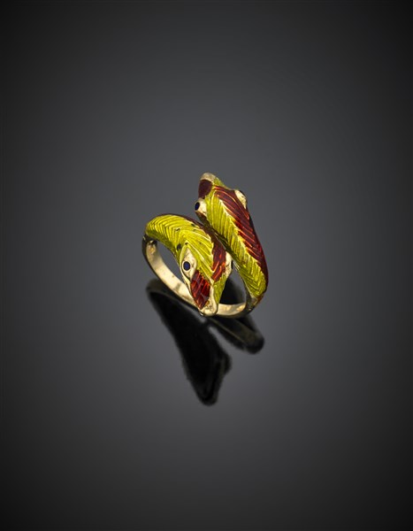 Anello in oro giallo con smalti verdi e rossi a guisa di serpente, g 7,83 misur