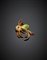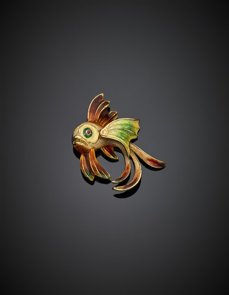Spilla in oro giallo e smalti a guisa di pesce, occhio segnato da rubino caboch