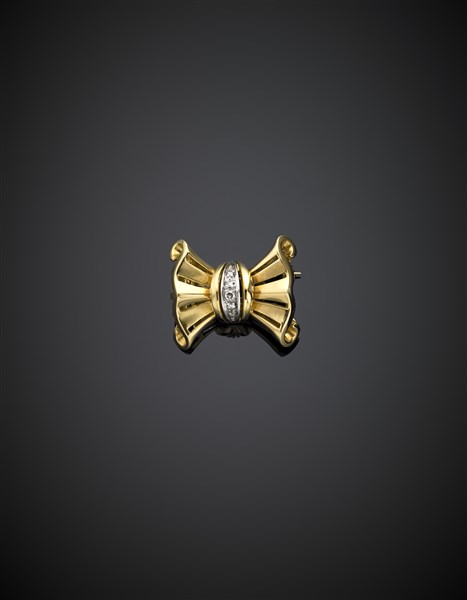 Spilla a guisa di fiocco in oro giallo e diamanti al centro, g 12,64, lungh. cm 2,50, largh. cm 2,20, h cm 1,30 circa. Punzonato 2139AL.
