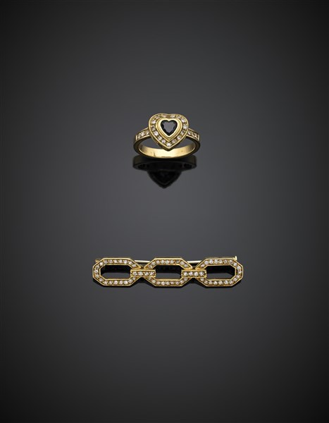 Lotto in oro giallo e diamanti composto da un anello con zaffiro a cuore misura 16/56 e una spilla di cm 4.8, diamanti per complessivi ct. 0,80 circa, complessivi g 13,35. Spilla marcata Corbetta.