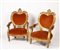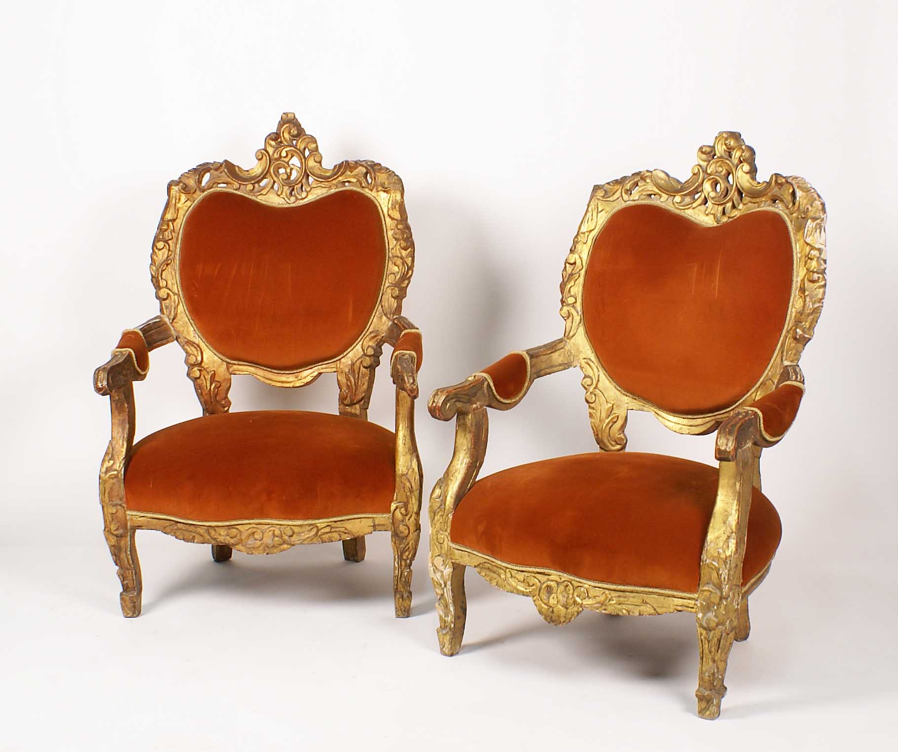 COPPIA DI POLTRONE IN LEGNO DORATO vecchia manifattura Intagliato a motivo di volute con sedute, schienali e braccioli imbottiti e rivestiti in tessuto H. 118 cm.