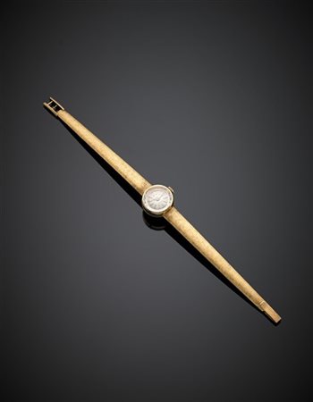 Orologio da polso da donna in oro giallo con bracciale modulare satinato e lucido, cassa n° 2343 3599, g 25,24, lungh. cm 17,50, diam. cm 1,9 circa. Cassa e quadrante firmati Levrette.