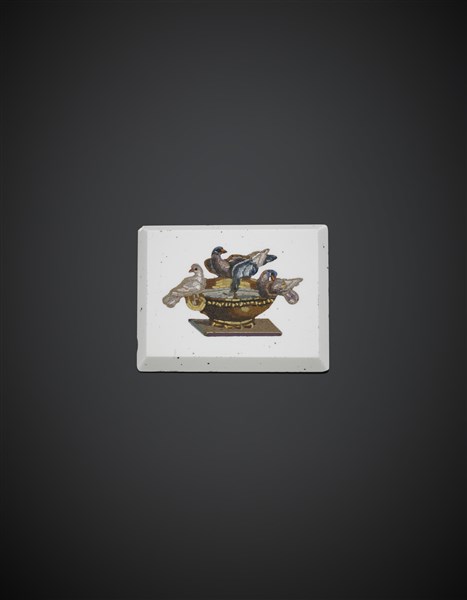 Micromosaico raffigurante colombe alla fonte su agata bianca rettangolare, g 14,64, lungh. cm 3,90, largh. cm 3 circa.