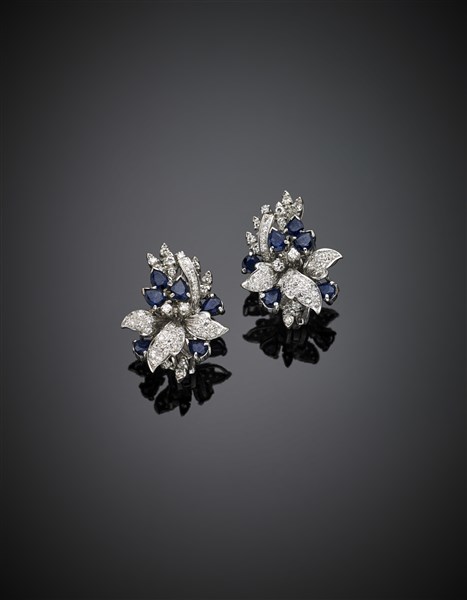 Orecchini a lobo con clip a foglie e fiori in oro bianco, diamanti e zaffiri, g 10,42, lungh. cm 2,90 circa. Marcati all'interno 01399.