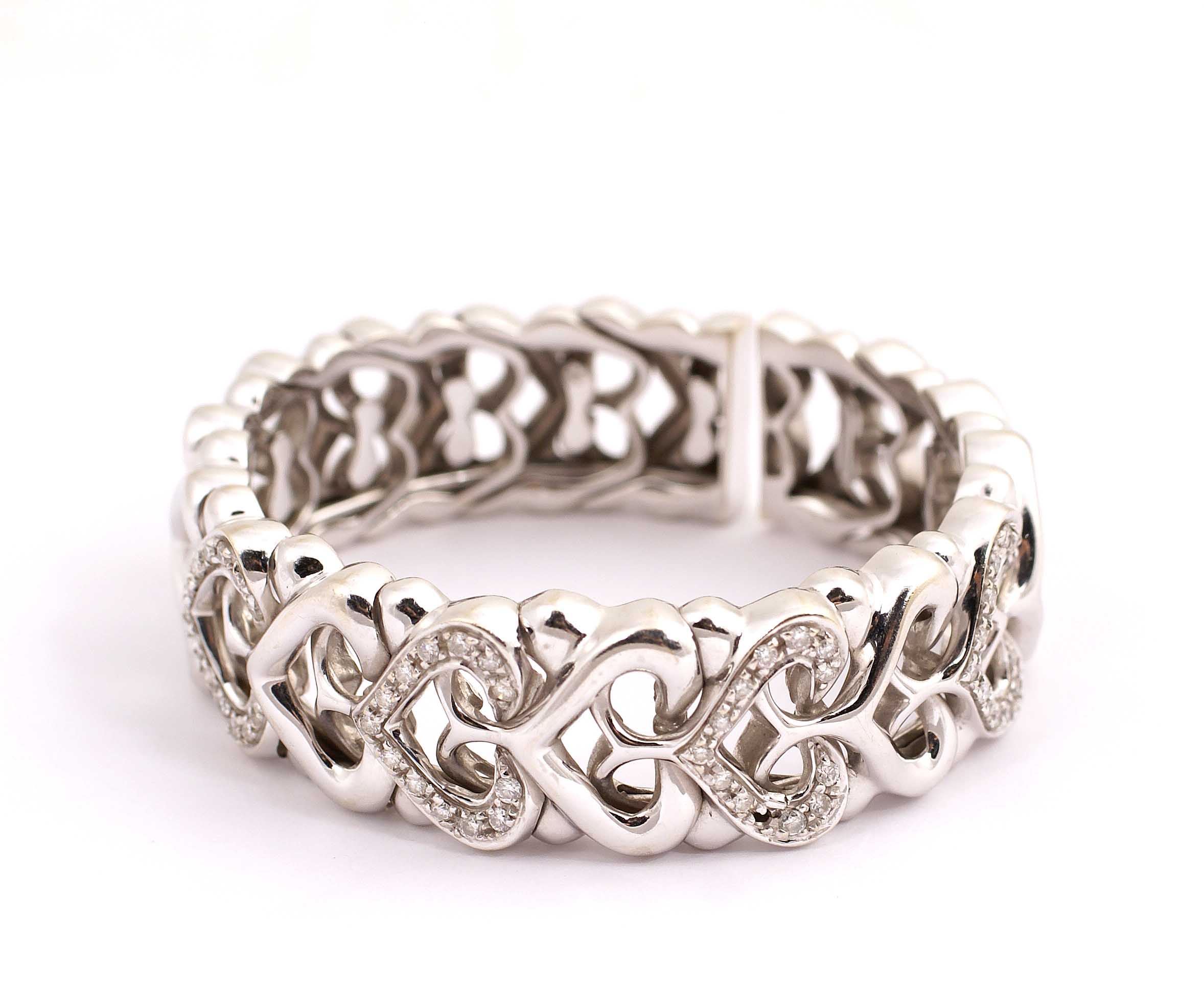 BRACCIALE A MANETTA IN ORO BIANCO 18KT A motivi di cuori alternati da diamanti taglio brillante per carati 1 circa (uno mancante) Peso 66 gr.