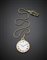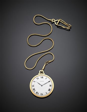 Orologio da tasca in oro giallo con catena in metallo dorato, catena cm 45.30, orologio diametro cm 4.10 circa, lordi g 34,03. Con custodia originale
