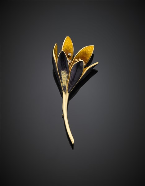 Yellow gold and enamel flower brooch, diamonds on the pistils, g 18.40, length cm 6.70 circa. Signed and marked Fasano, 26 AL (Illario). In Fasano case (defects)