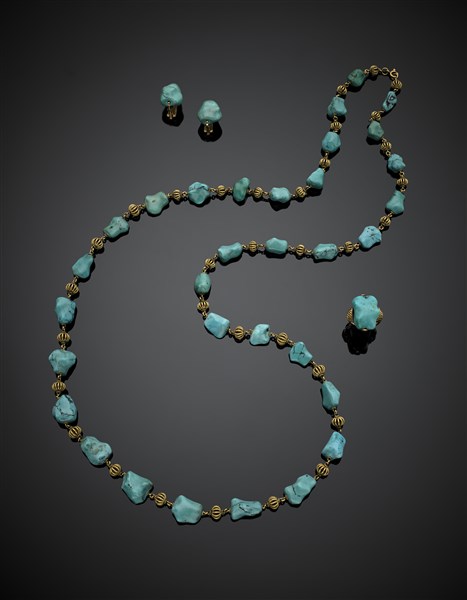 Tumbled turquoise and yellow partly chiselled gold jewelry set comprising cm 92 necklace, cm 1.5 earclips and ring size 6/46, in all g 107.35.