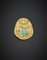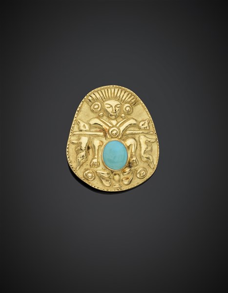 Spilla a scudo in oro giallo in parte sabbiato a guisa di divinità, rifinita con pietra azzurra opaca, g 20,05, lungh. cm 4,90 circa.