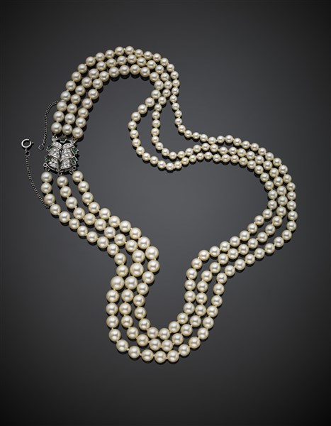 Collana a tre fili di perle coltivate rifinita con chiusura in oro bianco, diamanti per complessivi ct. 0,80 circa e smeraldi g 75,50, lungh. cm 48,70 circa.