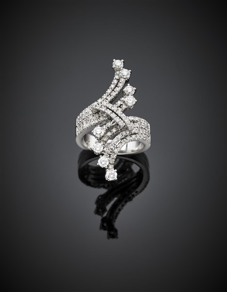 Anello a contrariè in oro bianco rifinito con diamanti per complessivi ct. 1,20