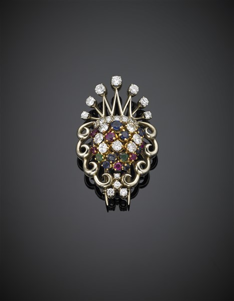 Spilla in oro bianco e giallo a guisa di stemma coronato con diamanti, rubini, zaffiri e smeraldi, g 14,80, lungh. cm 3,90 circa. Marcato 351 MI.
