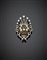 Spilla in oro bianco e giallo a guisa di stemma coronato con diamanti, rubini,