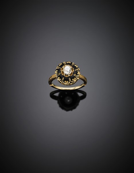 Anello in oro giallo rifinito con smalto nero e diamante a cuscino centrale di ct. 0,40 circa, g 3,88 misura 10/50. In scatola Spoggi Milano (lievi difetti)