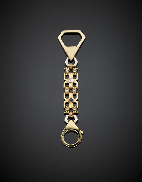 Portachiavi in oro giallo, bianco e rosa con piccolo zaffiro cabochon, g 23,67, lungh. cm 10,10 circa. Firmato e marcato Polese, 604 NA, 1562 VI.