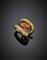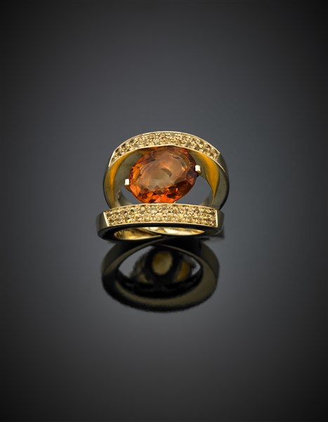 Anello in oro giallo con quarzo citrino di ct. 6,50 circa, corindoni gialli rif