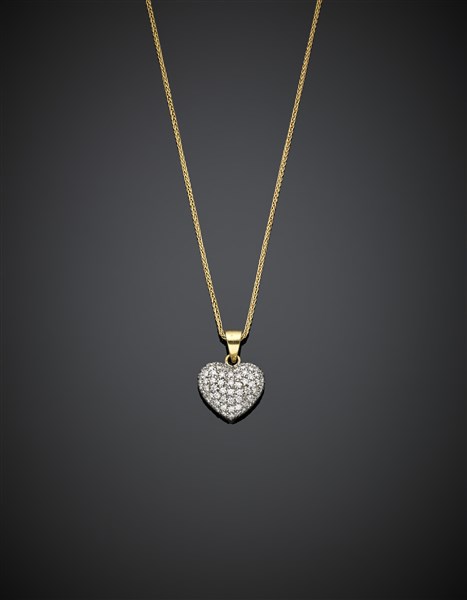 Catenina in oro giallo con pendente in oro bianco e giallo a guisa di cuore rifinito con diamanti a pavé per complessivi ct. 0,50 circa, g 7,48, lungh. cm 50 circa. Catena firmata e marcata Gora, 645 AL, pendente marcato 3139 AL.