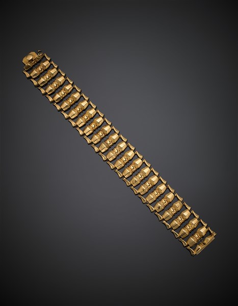 Bracciale modulare in oro giallo in parte cesellato, g 28,07, lungh. cm 18,50, largh. cm 2,40 circa. Marcato OVG, 186 VI.