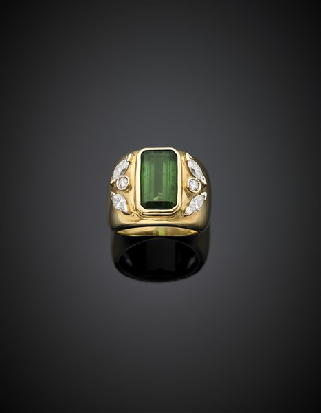 Anello in oro giallo con diamanti a navette e tondi e una tormalina rettangolar
