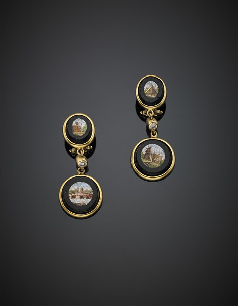 Orecchini pendenti in oro giallo e micromosaici su onice, piccoli diamanti a rifinirli, g 15,28, lungh. cm 4,20 circa. Marcati 1601 MI.