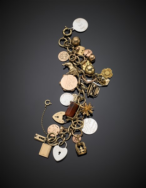 Yellow 9K gold bracelet with silver, 9K and 18K gold charms of various shapes , one charm as a book with a Ruben Dario spanish poem, g 87.89, length cm 21 circa. On the charms 373 VA, 1572 MI, 749 MI, english and danish marks (defects).