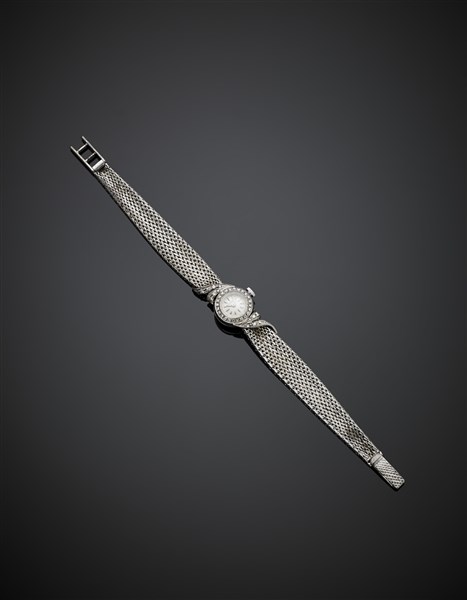 Orologio da polso da donna in oro bianco e diamanti per complessivi ct. 0,50 circa con bracciale in oro bianco intrecciato e in parte cesellato, g 46,47, lungh. cm 17,50 circa. Quadrante firmato Longines.