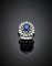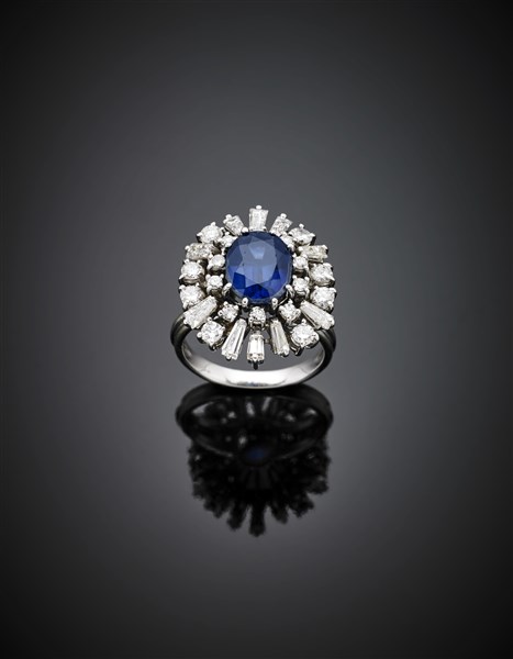 Anello in oro bianco rifinito con diamanti per complessivi ct. 1,70 circa e doppietta blu centrale g 8,40 misura 15,50/55,50.