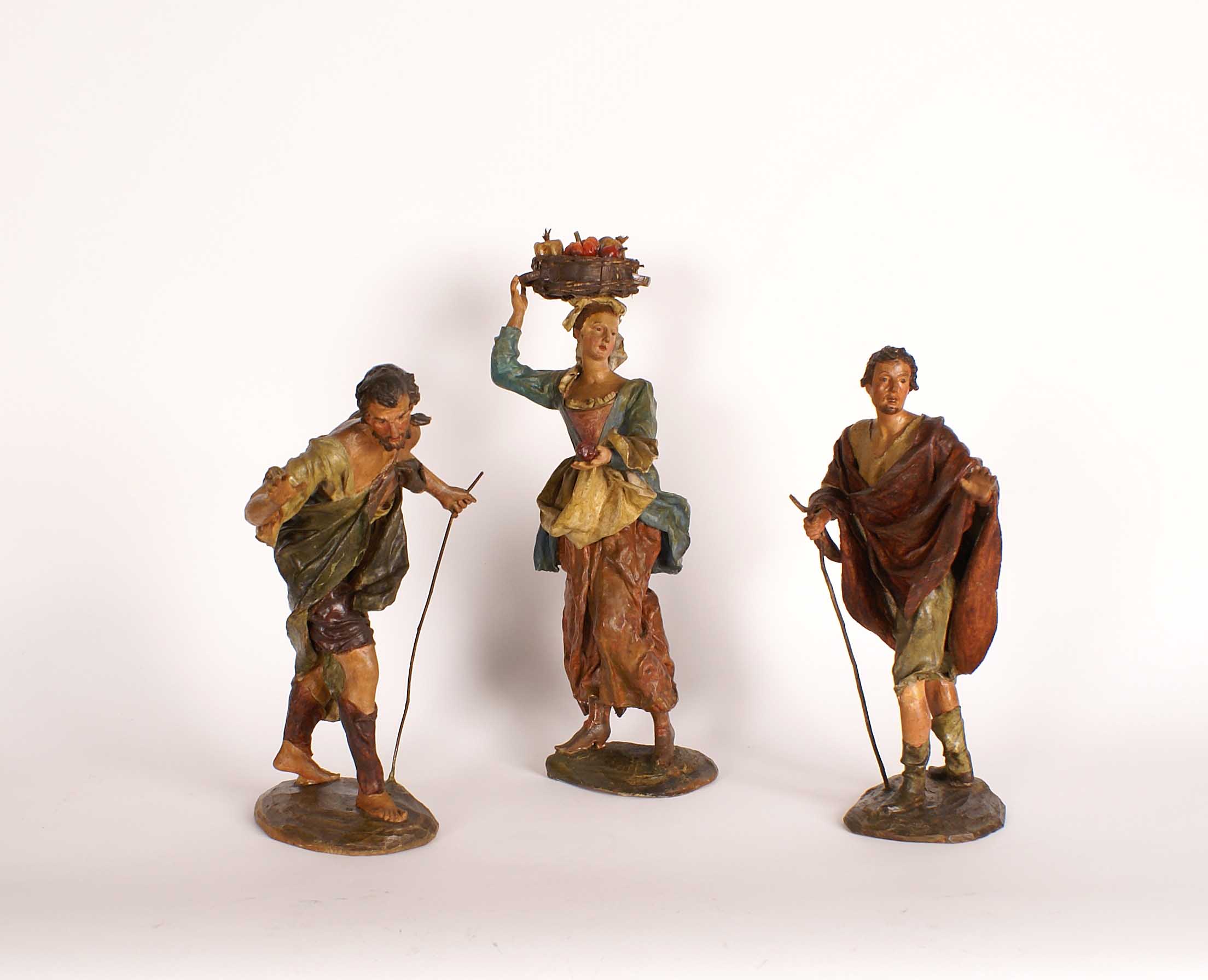 TRE PERSONAGGI DEL PRESEPE Napoli XVIII Sec. Raffiguranti due pastori ed una contadina, eseguiti sui modelli della pittura napoletana del 700 Dim. da cm. 30 a cm. 37 cm.