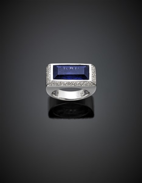 Anello in oro bianco con grande iolite rettangolare, taglio a gradini di ct. 3,75 circa, piccoli diamanti a rifinirla, g 14,70 misura 15.50/55.50. Traforato PVG.