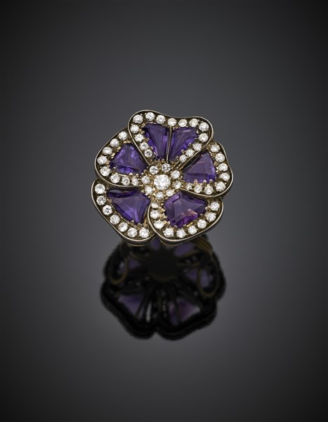 Lotto 773 | Anello in oro giallo e argento a guisa di fiore con ametiste e diamanti per com