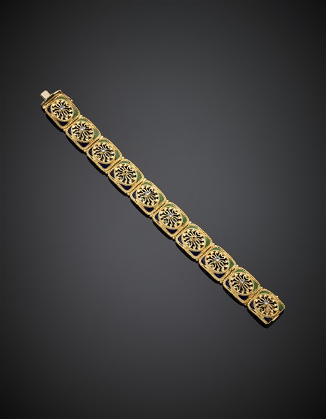 Yellow wrought gold green and blue enamel openwork modular bracelet accented with blue synthetic stones, g 43.16, length cm 19 circa. Marked 37 AR. (losses)