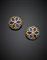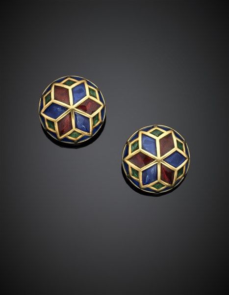 Yellow gold multicolor plique-a-jour enamel earclips, g 23.67, diam. cm 2.5. Signed Mila Shoen.