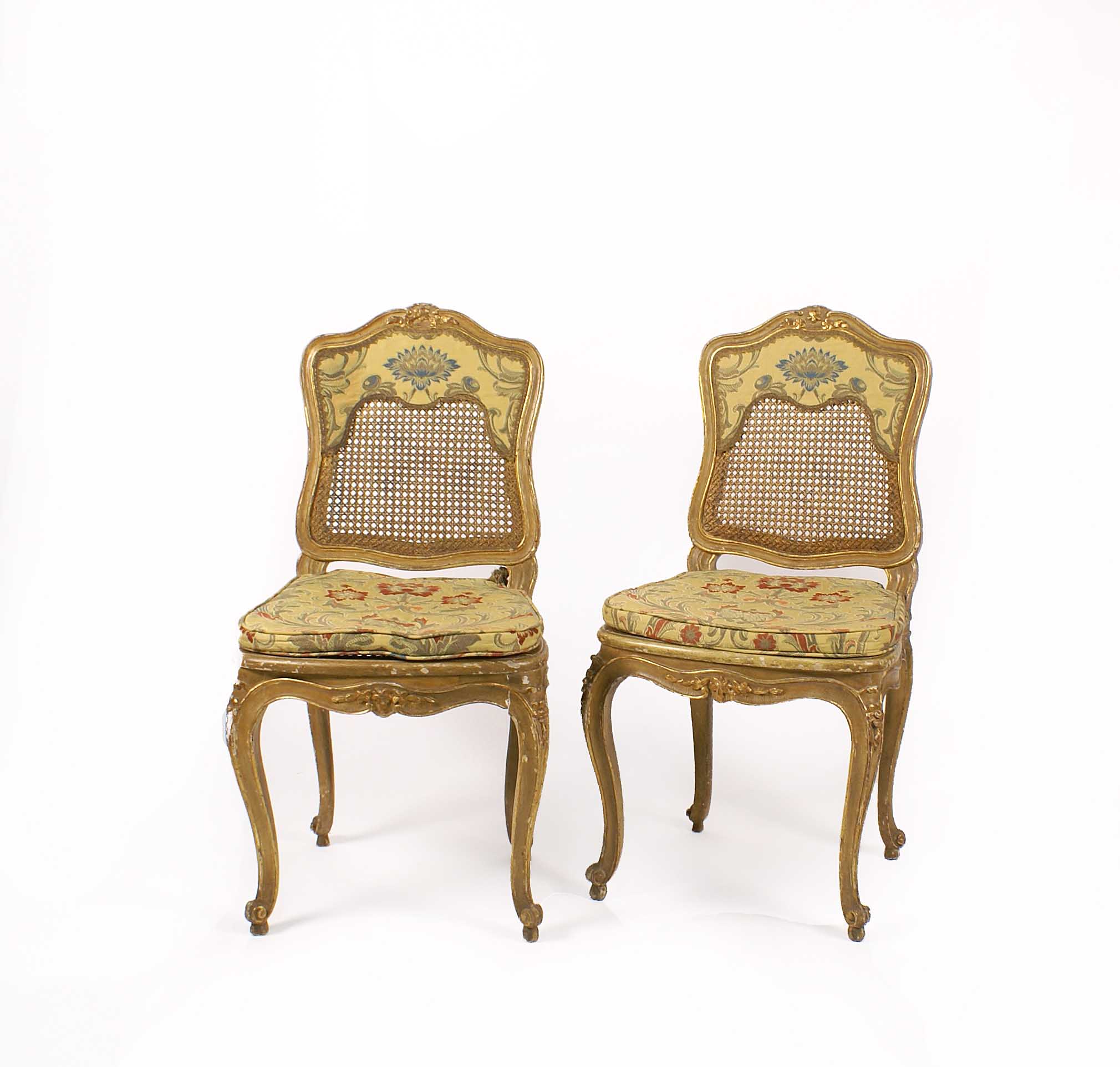 OTTO SEDIE IN LEGNO DORATO ED INTAGLIATO Francia fine del XIX Sec. Schienali e sedute rivestiti in paglia di Vienna, complete di relativi cuscini in tessuto, (difetti) H. 97 cm.