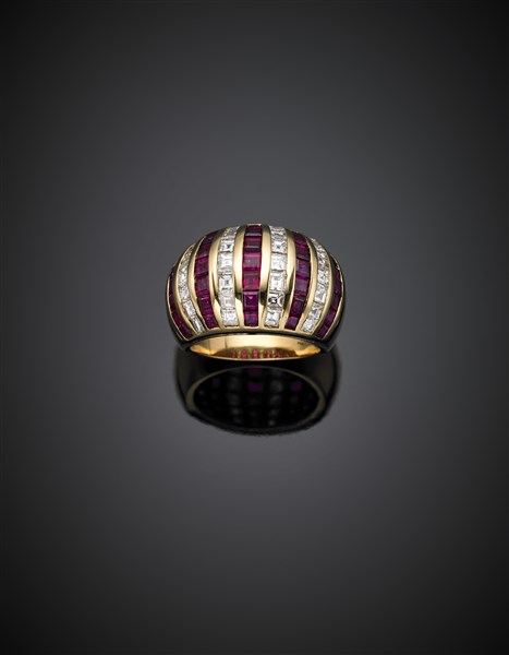 Lotto 790 | *SABBADINI Anello in oro giallo, diamanti e rubini calibré, g 12,50 misura 11/5