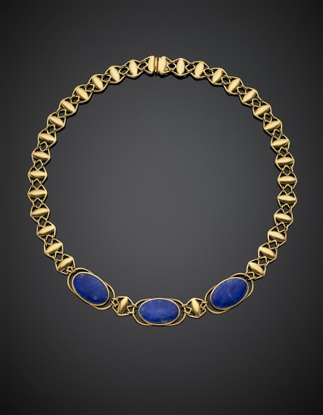 Collana modulare in oro giallo con al centro tre lapislazzuli ovali, g 58,42, lungh. cm 41,50 circa.